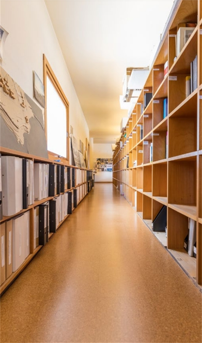 實木書柜貫穿了整個房間,辦公桌同樣采用實木材料與軟木地板天然紋理相融合,整個空間充斥著柔和的色調。軟木材料降噪且柔軟的特性,使得身處室內卻仍能讓人感受到自然的溫暖與厚重。
