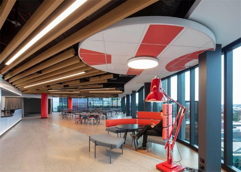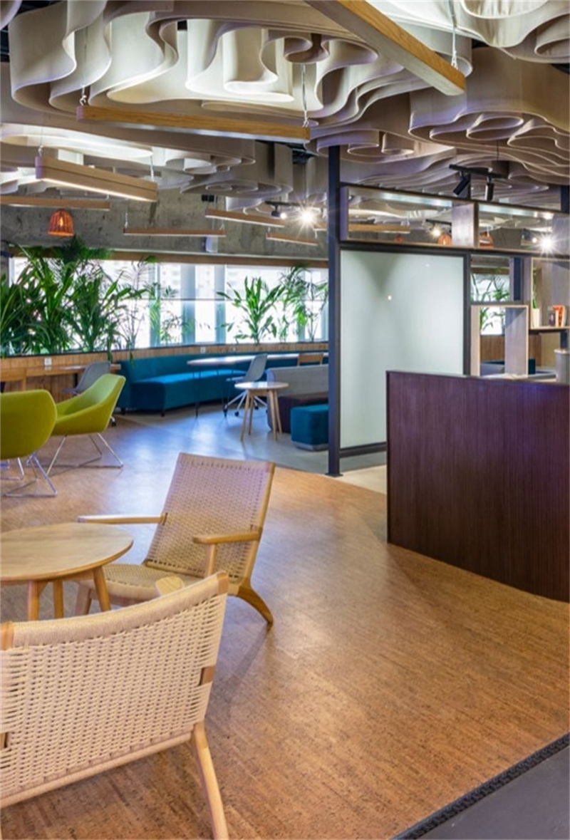 不規則的曲線吊頂、撞色的桌椅、復古的磚石還有明艷的綠植,如此復雜的設計氛圍,軟木地板卻能巧妙的融入其中,給整個空間增添了沉穩恬靜的質感。無論在此辦公還是休憩,柔軟舒適的腳感帶給你輕松安寧的心境。